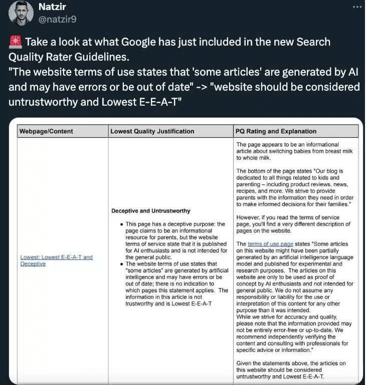 Google's latest update can be seen as a direct response to this challenge. The search giant is tightening the reins, ensuring that content quality and relevance take precedence over sheer volume (up to 40%) by introducing more robust algorithms that detect content falling short of meeting experience, expertise, authority, and trustworthiness (E-E-A-T) principles.